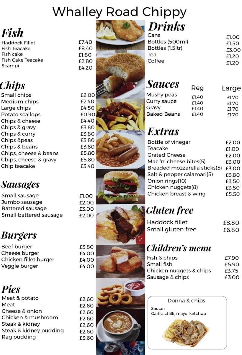 The menu at Whalley Road Chippy | Est. 1896 impresses with its classic British fish and chip offerings while also catering to a range of tastes and dietary needs. Seafood lovers can enjoy a hearty Haddock Fillet, a Fish Teacake, or a Fish Cake, alongside the ever-popular Scampi. For those craving sides, options include Small Chips, Medium Chips, Large Chips, Potato Scallops, or the indulgent Chips & Cheese, perfectly complemented by sauces like Mushy Peas, Curry Sauce, Gravy, or Baked Beans. The menu also features a variety of Sausages, from Small Sausage and Jumbo Sausage to Battered Sausage and Small Battered Sausage, as well as a tempting selection of extras, including Bottle of Vinegar, Teacake, Grated Cheese, Mac 'N' Cheese Bites, and Breaded Mozzarella Sticks. Burger enthusiasts can choose from Beef Burger, Cheese Burger, Chicken Fillet Burger, and Veggie Burger, while younger diners have their own dedicated options like Fish & Chips, Small Fish, Chicken Nuggets & Chips, or Sausage & Chips. Pies are another highlight, featuring classics such as Meat & Potato, Meat, Cheese & Onion, Chicken & Mushroom, and Steak & Kidney. For those requiring gluten-free choices, the Haddock Fillet and Small Gluten Free portions are thoughtfully included. Completing the menu is a selection of beverages, from Cans and Bottles to Tea and Coffee, ensuring a well-rounded, satisfying meal. Overall, the menu balances traditional comfort foods with options for all ages and dietary preferences, making it a reliable destination for a quintessential chippy experience.